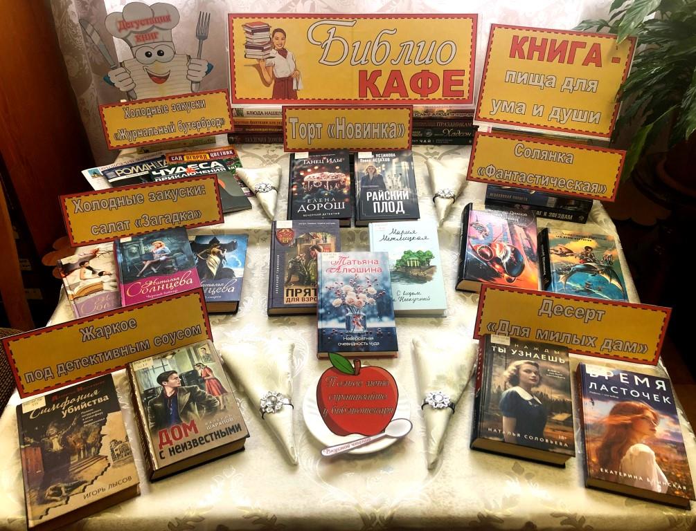 Наше литературное меню поражает своим разнообразием: предлагаем продегустировать холодные закуски «Журнальный бутерброд» или салат «Загадка»; солянку «Фантастическая»; аппетитное жаркое под детективным соусом; десерт «Для милых дам» и, конечно же, восхитительный торт «Новинка». И помните, все эти «блюда» в нашей библиотеке абсолютно бесплатны! Хотя искренняя улыбка и хорошее настроение станут лучшей «благодарностью».