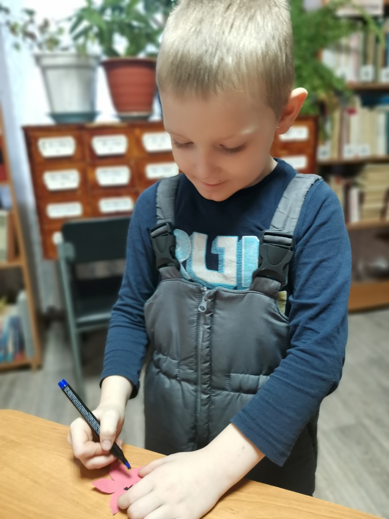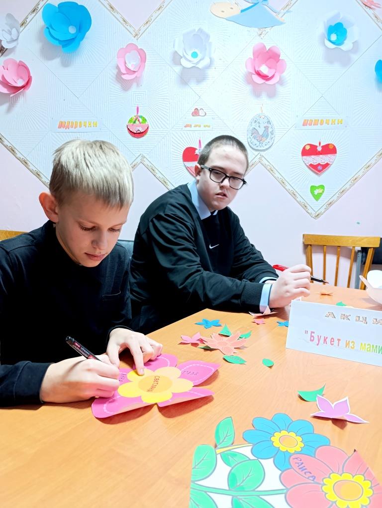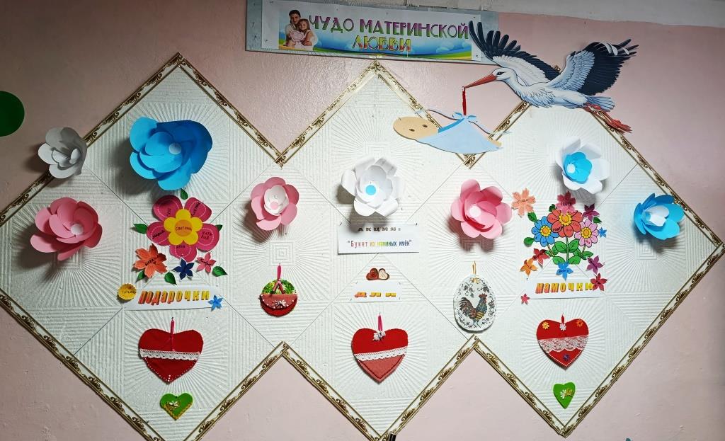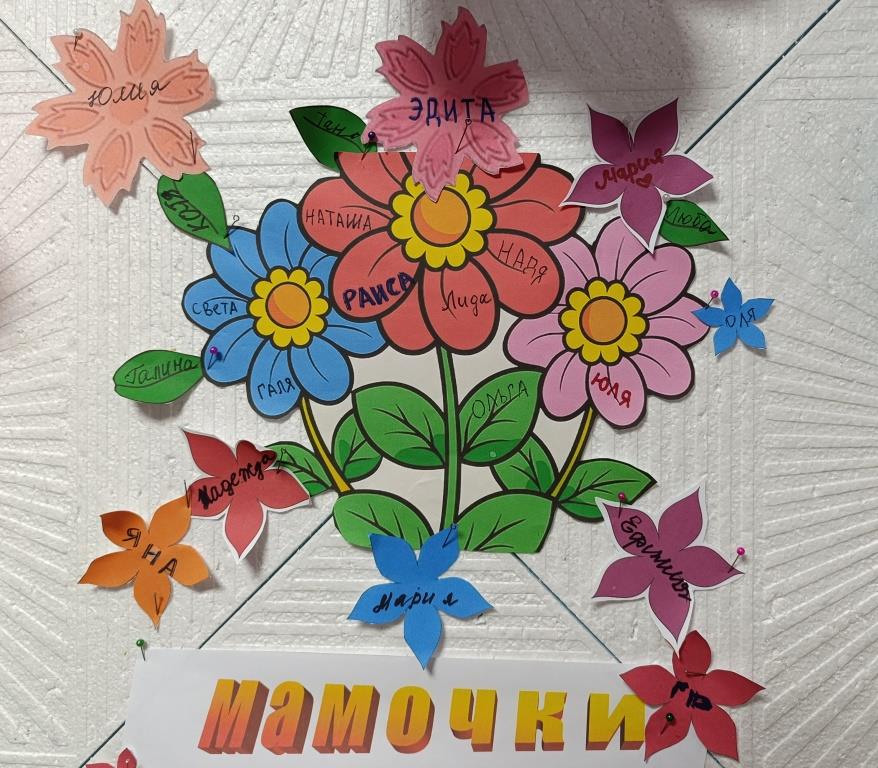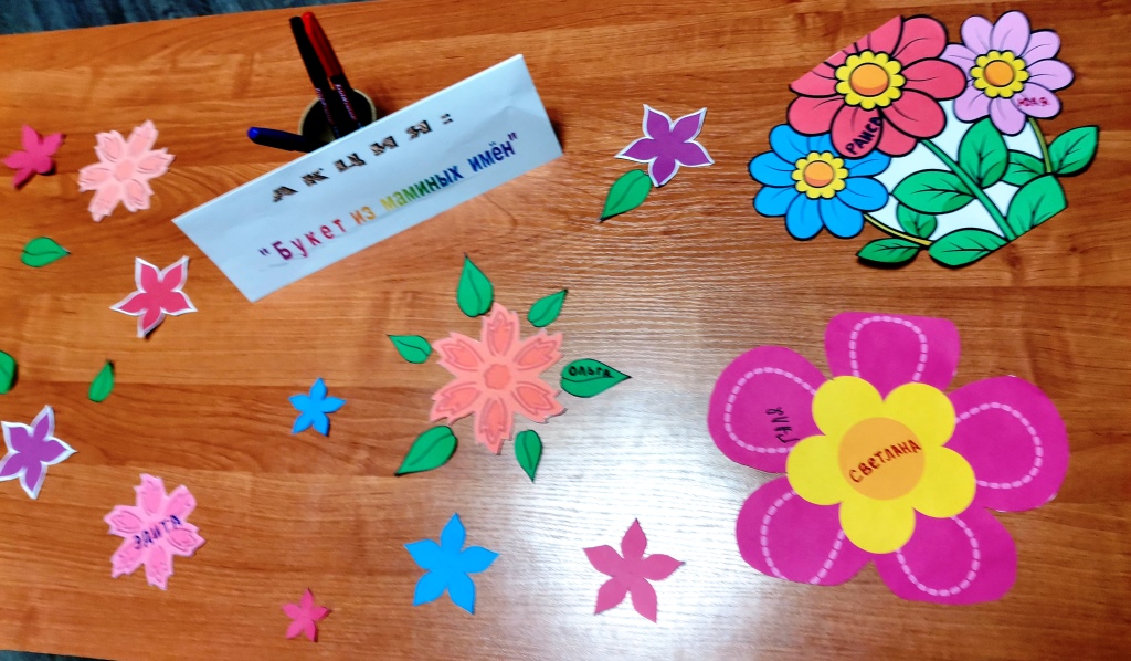В течении недели читатели нашей библиотеки писали на цветочках, листочках имена своих мам. В итоге получился красивый букет, который прекрасно вписался на выставке, посвящённой этому дню.