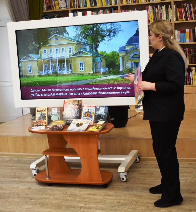 Используя мультимедийную презентацию, библиотекарь познакомила школьников с интересными фактами из жизни Лермонтова: о детстве в родных Тарханах, о студенческих годах и военной службе на Кавказе, о многогранном творчестве поэта и трагической гибели.