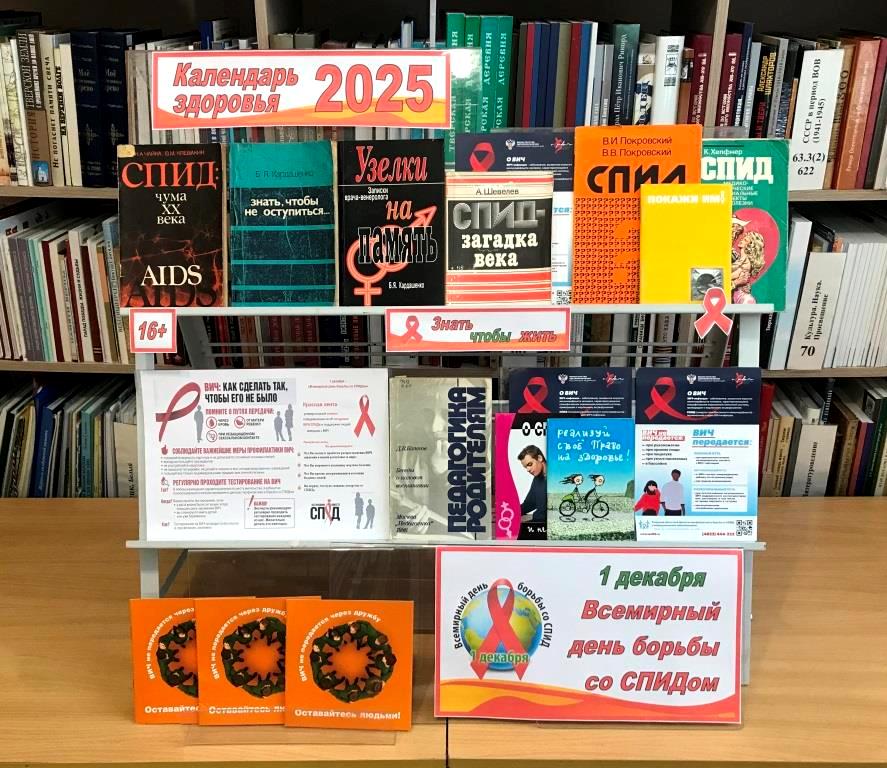Получить дополнительные знания об этой страшной болезни можно из книг и информационных брошюр, представленных на выставке «Календарь здоровья: 1 декабря – Всемирный день борьбы со СПИДом».