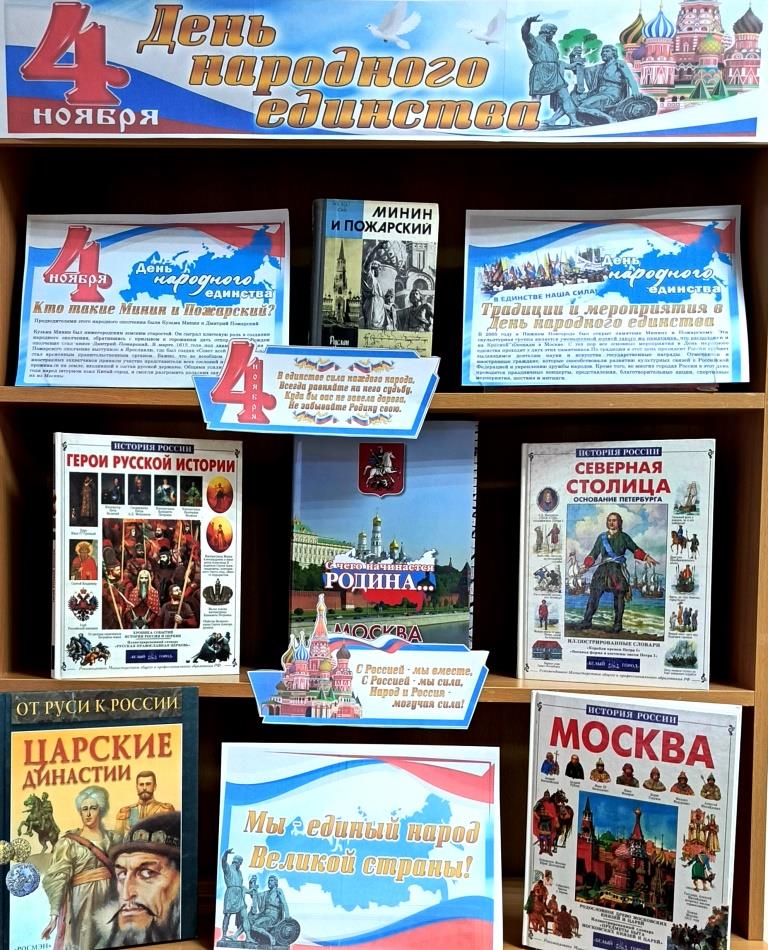 К этому празднику в Торопацкой библиотеке оформлена информационная выставка. Ознакомившись с представленными здесь материалами, читатели смогут узнать о судьбоносных событиях русской истории XVΙΙ века, о подвиге Кузьмы Минина и Дмитрия Пожарского, руководителей народного ополчения в Смутное время, о становлении государства Российского, а также о традициях празднования Дня народного единства.
