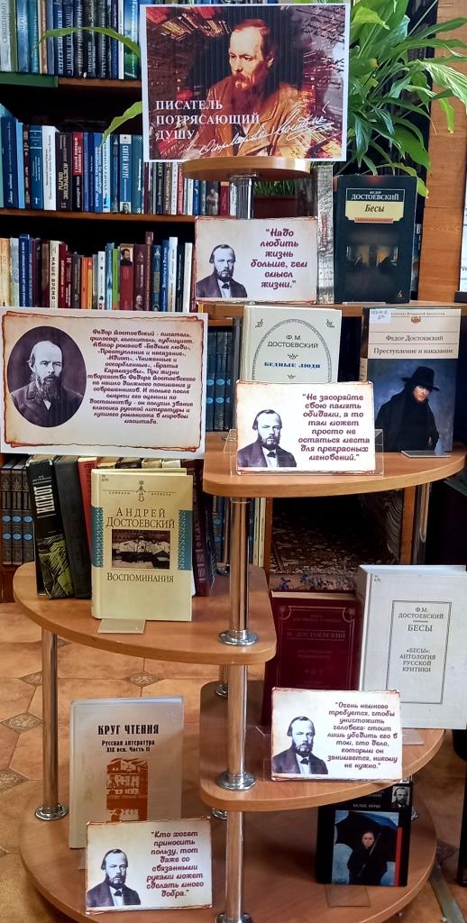 На абонементе Андреапольской библиотеки к дате рождения писателя (11 ноября 1821г.) оформлена книжно-иллюстративная выставка, на которой представлены издания романов Ф.М. Достоевского из фондов библиотеки. На выставке можно познакомиться с произведениями как самого Фёдора Михайловича, так и других деятелей искусства, критиков и современников о его творчестве.