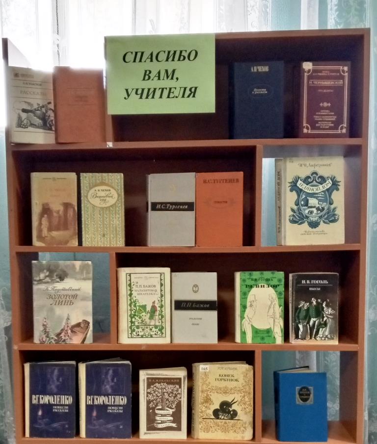 На книжной выставке "Спасибо Вам, учителя" представлены произведения Ивана Андреевича Крылова, Михаила Михайловича Пришвина, Антона Павловича Чехова, Николая Васильевича Гоголя, Петра Павловича Ершова, Павла Петровича Бажова, Ивана Ивановича Лажочникова и других классиков. На выставке каждый сможет узнать подробнее о жизненном пути каждого из них.