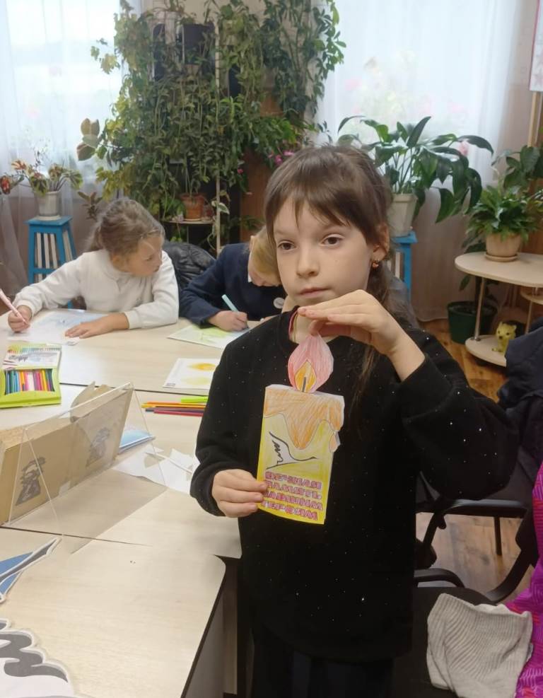 Затем началась кропотливая работа: участники мастер-класса аккуратно разукрашивали и вырезали необходимые элементы для своих свечей. Каждый из них подходил к процессу с серьезностью и вниманием, понимая, что создаваемая ими поделка — это не просто изделие, а символ памяти и уважения к павшим героям.