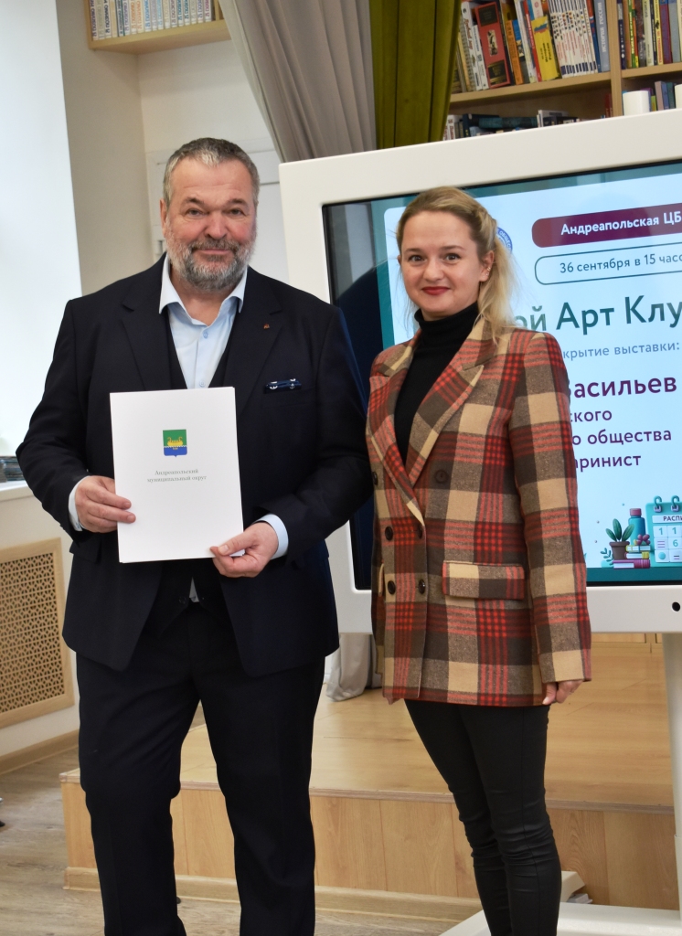 Начальник Отдела культуры Администрации Андреапольского муниципального округа Юлия Геннадьевна Цыгулева поблагодарила Анатолия Михайловича Васильева за активную творческую позицию, длительное и плодотворное сотрудничество с Андреапольской библиотекой в организации просветительских мероприятий, проведение творческих вечеров и выставок, личный вклад в пополнение книжного фонда библиотеки и вручила благодарственное письмо.