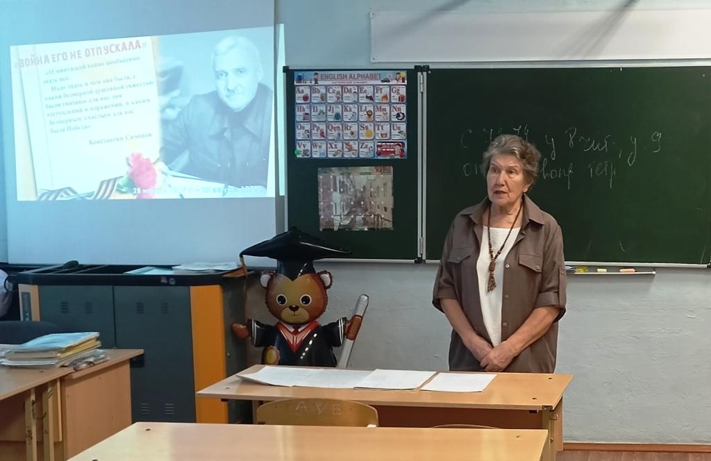 110 лет со дня рождения Константина Симонова (1915-1979) отметили учащиеся 8 «Б» класса школы № 2. Для них руководитель читательского объединения «Гармония» Е.И. Локтева и заведующая детской библиотекой В.Н. Красицкая провели выездной библиоурок, посвященный поэту, прозаику, драматургу и прежде всего легендарному военному корреспонденту, чьё творчество стало летописью целой эпохи.