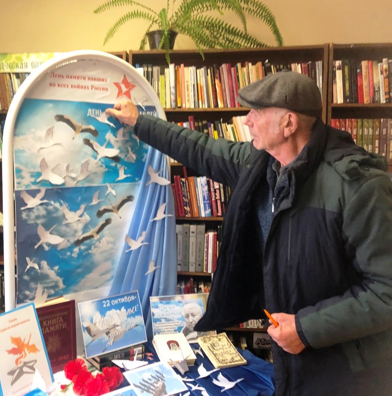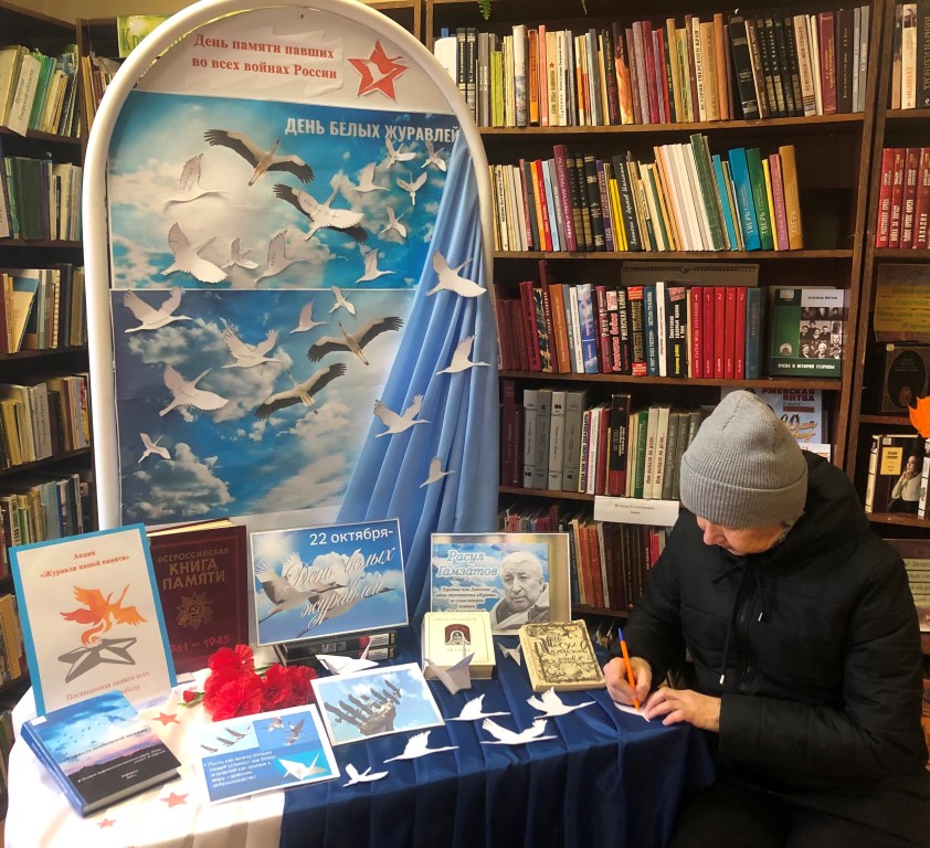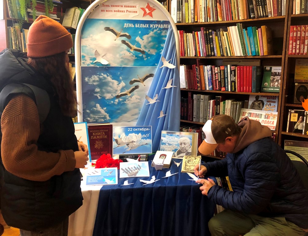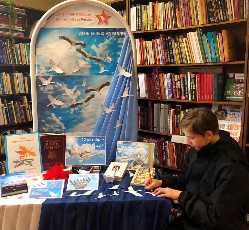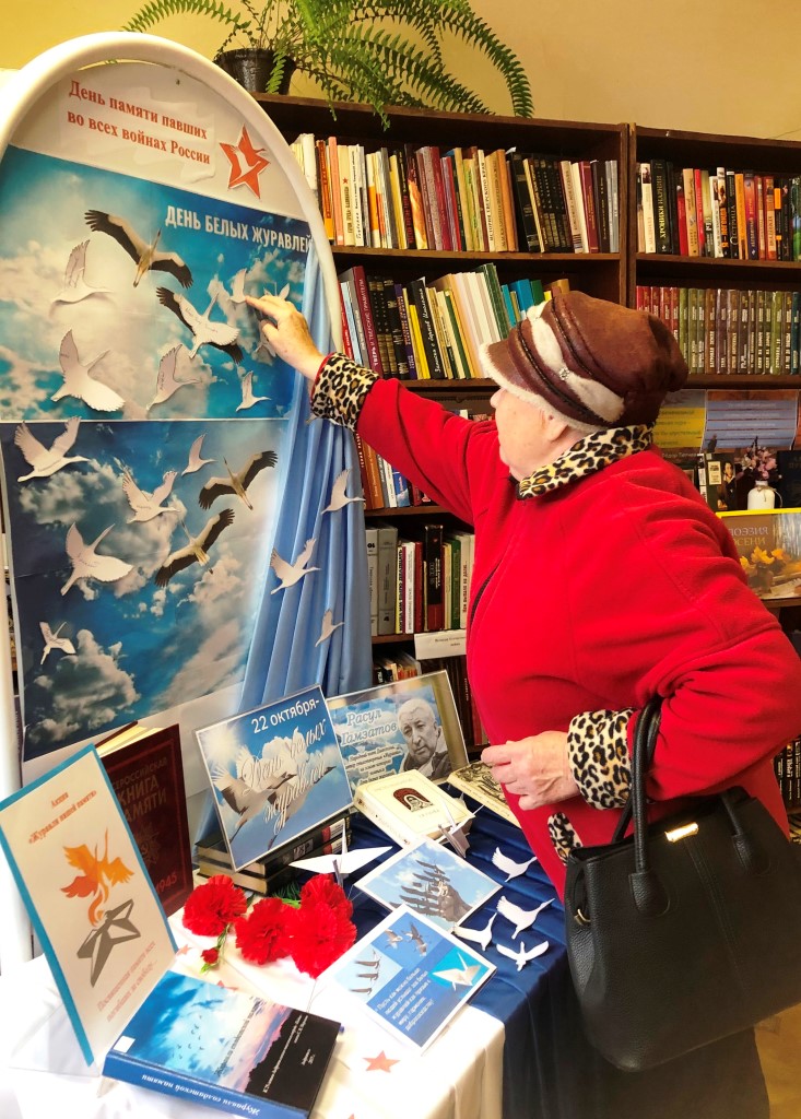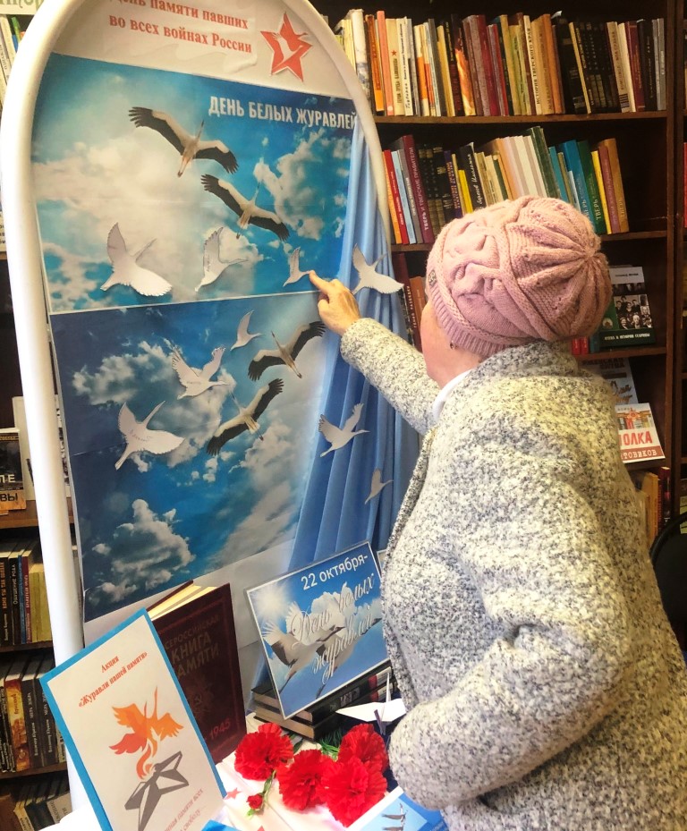 Читатели писали на крыльях бумажных журавликов имена своих близких, чью жизнь оборвала Великая Отечественная война и другие военные конфликты. Эти белые журавли, словно вестники небес, присоединялись к скорбному клину на стенде.